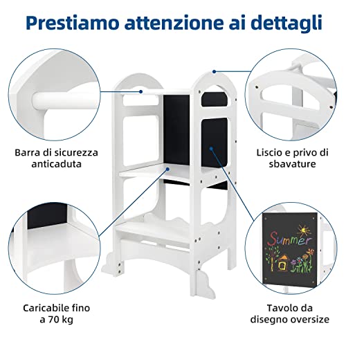 Learning tower con Lavagna: Diversi studi hanno mostrato come l'arte sia un modo per i bambini di esprimersi, soprattutto nei più giovani! I tuoi bambini piccoli possono esprimere le proprie idee nei disegni, esercitarsi nelle lettere e nell'aritmetica attraverso scarabocchi.