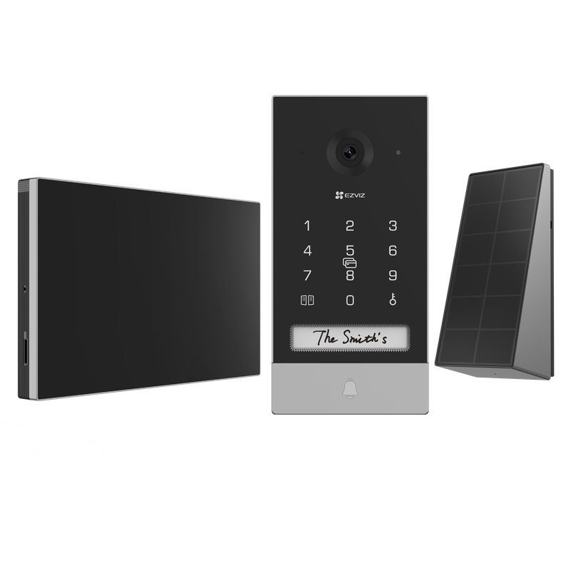 Videocitofono Wi-Fi HaLow con monitor touch 7". Posto esterno a batteria con pannello solare. Visione notturna e rilevazione intelligente del movimento umano. Apre 1 serratura e 1 porta automatica. Apertura da monitor, app EZVIZ, smart tag (3 in dotazione) o tastierino numerico su posto esterno. Registrazione su MicroSD (max 512GB)