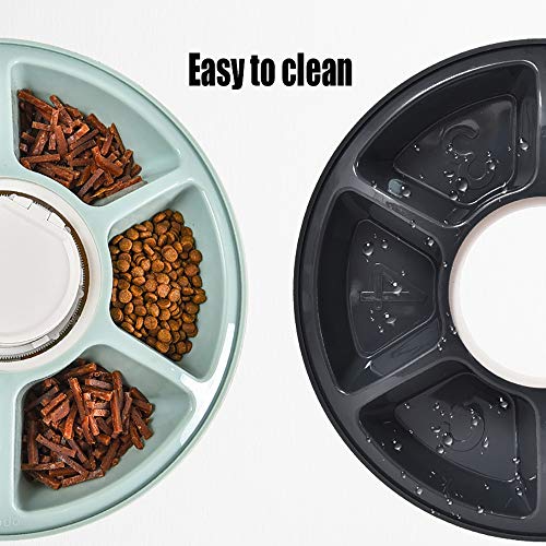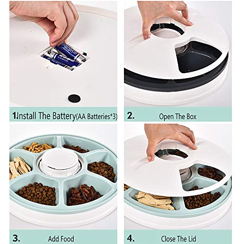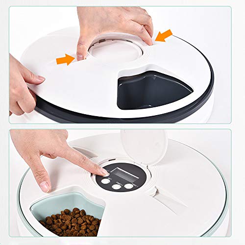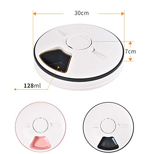 6 Pasti design: massimo impostabile di 6 pasti a 6 volte differenti in anticipo. L'alimentatore automatico pet fornisce 6 griglie quale volume è 128ml. È possibile mettere in cibo umido o secco a seconda di quanto il tuo animale domestico mangia ..