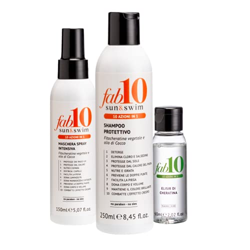 Fab10, Trattamento Multibenefit Sun & Swim, Trattamento Professionale per Capelli con 10 Benefici, Nutre, Idrata e Protegge i Capelli Esposti al Sole, Contiene Shampoo, Maschera, Elisir di Cheratina
