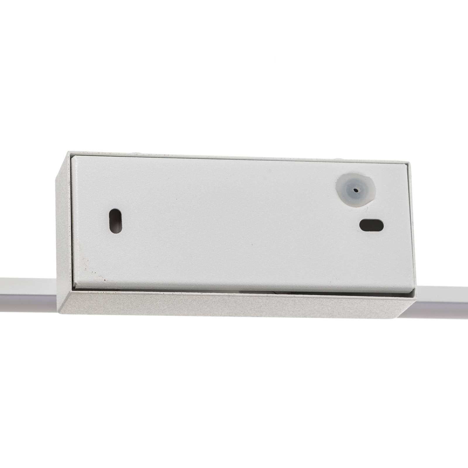 Specchio e luce per quadri Nala per il montaggio a parete La lampada da parete a LED Nala ha un design chiaro e moderno. Un supporto a parete rettangolare porta una striscia attraverso un braccio, il cui lato inferiore è coperto da un diffusore opaco in metacrilato. I LED a prova di schizzi posti all'interno illuminano l'intera larghezza dell'apparecchio, in modo che quadri, specchi, lavabi o aree di lavoro poste al di sotto siano efficacemente alimentati da una luce bianca calda. Nala è ideale anche per un'elegante illuminazione supplementare nel corridoio.