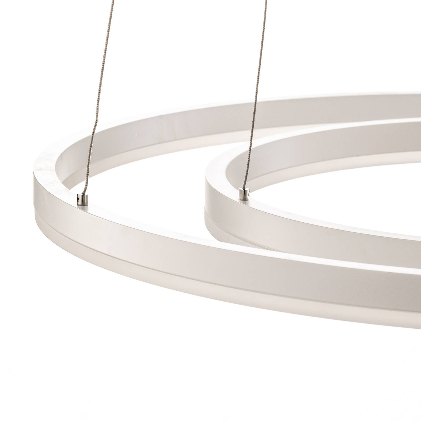 Apparecchio a sospensione a LED Giotto con due elementi luminosi ad anello in bianco La lampada a sospensione Giotto dal design raffinato con due elementi luminosi circolari fornisce un'illuminazione sapiente e convince grazie ai LED dimmerabili. Grazie al suo design compatto e semplice, si adatta a qualsiasi stile interno e fornisce una piacevole luce bianca calda. Una nobile sospensione in metallo fornisce supporto al soffitto. I due elementi di luce rotondi sono attaccati ad esso a diverse altezze. Il più grande dei due elementi pende leggermente più in alto del più piccolo. I LED dimmerabili si trovano anche in un telaio stabile fatto di metallo in uno schema di colore bianco, che non solo rende l'apparecchio d'illuminazione attraente, ma lo rende anche stabile.