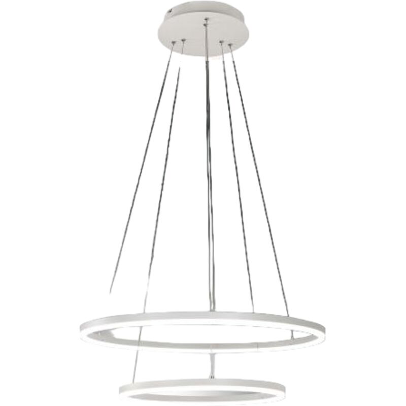 Lampadario a sospensione a led Giotto moderna, rotonda, in metallo di colore bianco e diffusore in metacrilato 52 Watt. Lampadario a led a sospensione di design composto da due anelli molto luminosi. Lampadario a led moderno dimmerabile, questa plafoniera ha la possibilità di variare l'intensità della luce con un dimmer non incluso. Disponibile la dimmerazione con sistema bluetooth. Dimensioni del lampadario, anello grande ø60cm, anello piccolo ø40cm, altezza regolabile fino a 200cm. Ideale da installare nelle abitazioni moderne in stanze come salotti, cucine, camere da letto, corridoi o bagni. Lampadario a led con un design moderno molto apprezzata da interior designer, architetti e progettisti, è molto luminosa. Lampadario a led a sospensione perfetto per arredare studi professionali, uffici, negozi o showroom. La lampada di colore bianco si adatta in tutti gli ambienti. Su richiesta, e un'aggiunta di prezzo, è possibile avere il lampadario a led Giotto regolabile con un