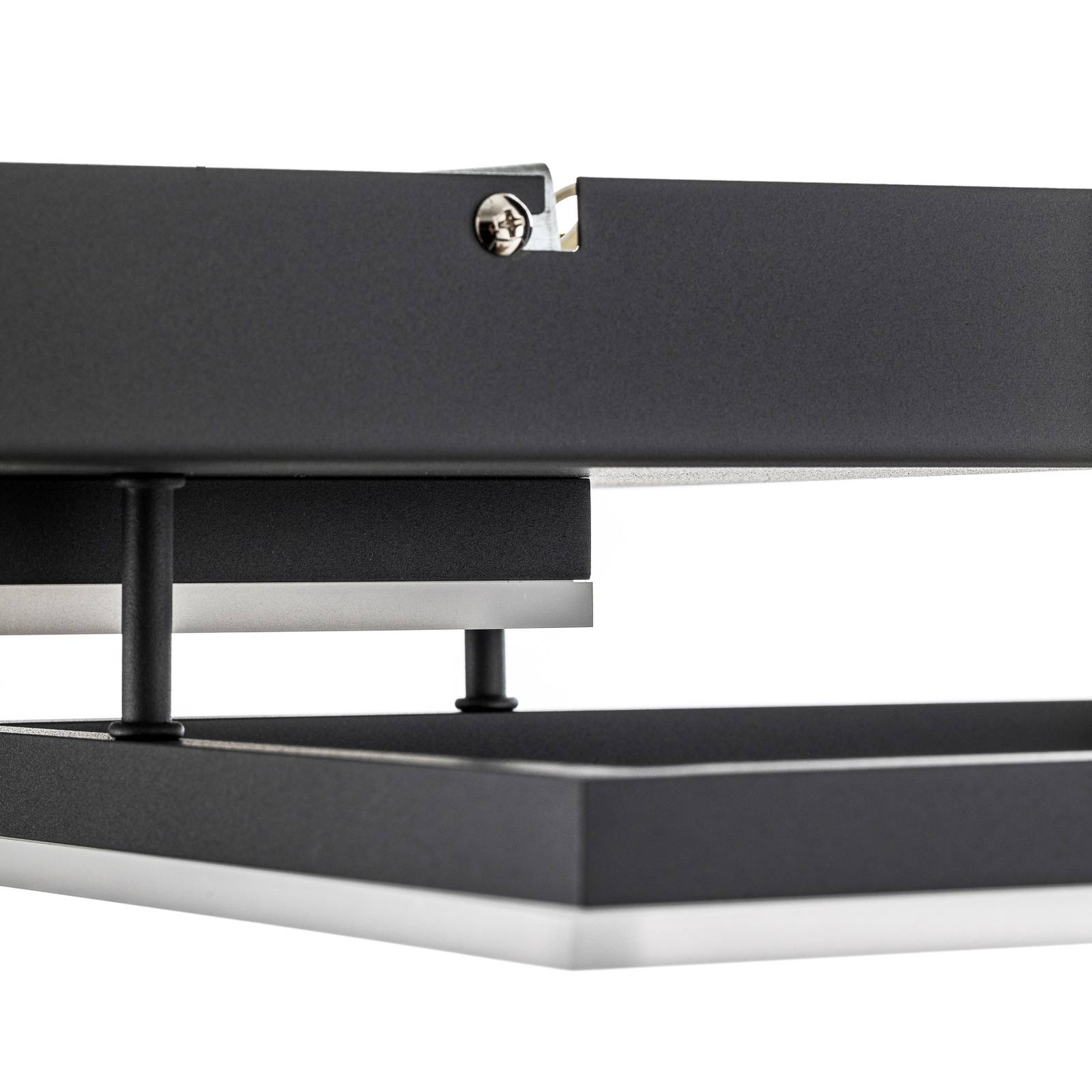 Plafoniera LED Bard color antracite L'ampia plafoniera LED Bard dal design moderno è facilmente dimmerabile tramite un dimmer esterno. Questo rende l'illuminazione della stanza molto flessibile. La lampada con cornice illumina la stanza con una luce piacevole e bianco caldo. Il design lineare, costituito forme, materiali e colori moderni, rende la lampada versatile da abbinare. Fissata al soffitto mediante un corpo quadrato color antracite, la lampada è effettivamente costituita da due cornici quadrate l'una sopra l'altra. I corpi sono abbracciati dal metallo grigio antracite e hanno quindi un aspetto sobrio ed elegante. In questo modo, ogni stanza acquisisce un concetto di illuminazione moderno che rapidamente attrae tutti gli sguardi.