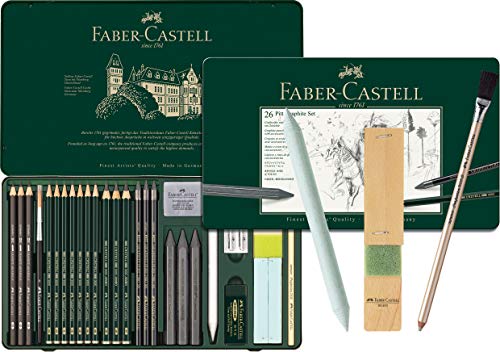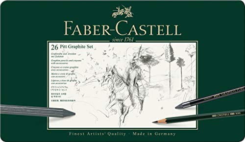 Faber-Castell Pitt Graphite Set di matite in custodia metallica, grande, 26 + 3 pezzi, inclusi matita da cancellare con pennello, raschietto per carta e blocco per affilare le mine