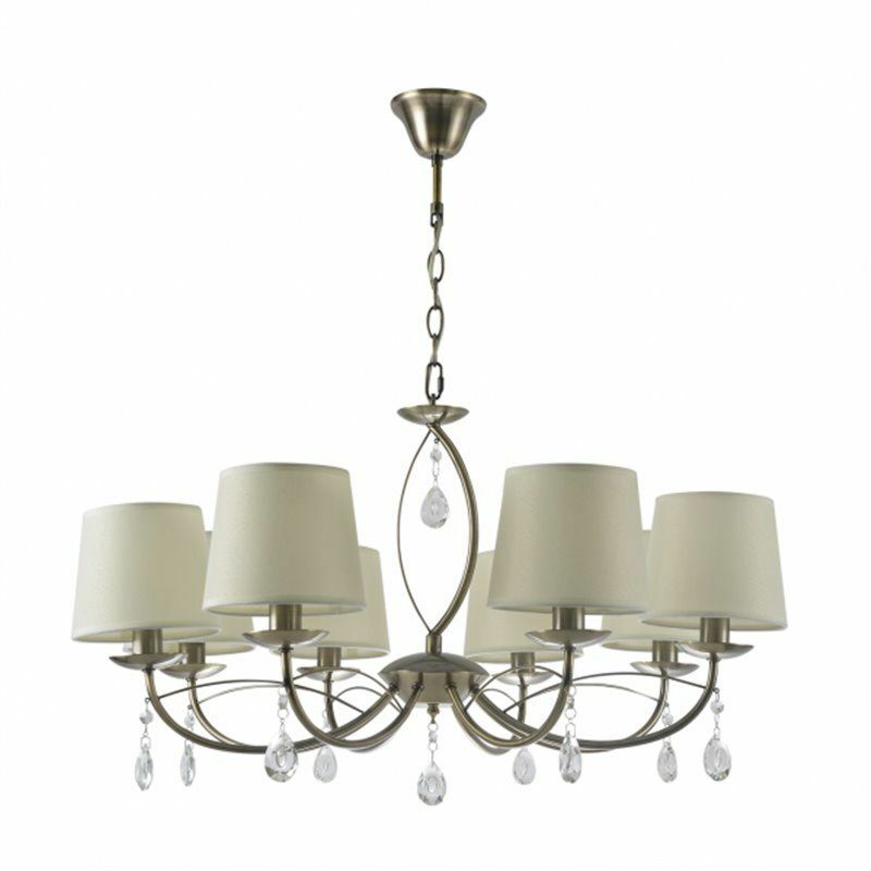 Lampada della serie Monterrey a otto luci color cuoio. È realizzato in metallo, vetro e materiale tessile beige. Ha un corpo a forma di occhiello da cui pende un piccolo ciondolo di cristallo, come in ciascuno dei suoi bracci. Le sue dimensioni sono 65 & lt, 90x19x67x67 cm (altezza regolabile). È inoltre disponibile in tonalità cromata/bianca. La famiglia si completa con il piano da tavolo, la lampada da terra e la lampada a cinque e tre luci. Il portalampada è E14.