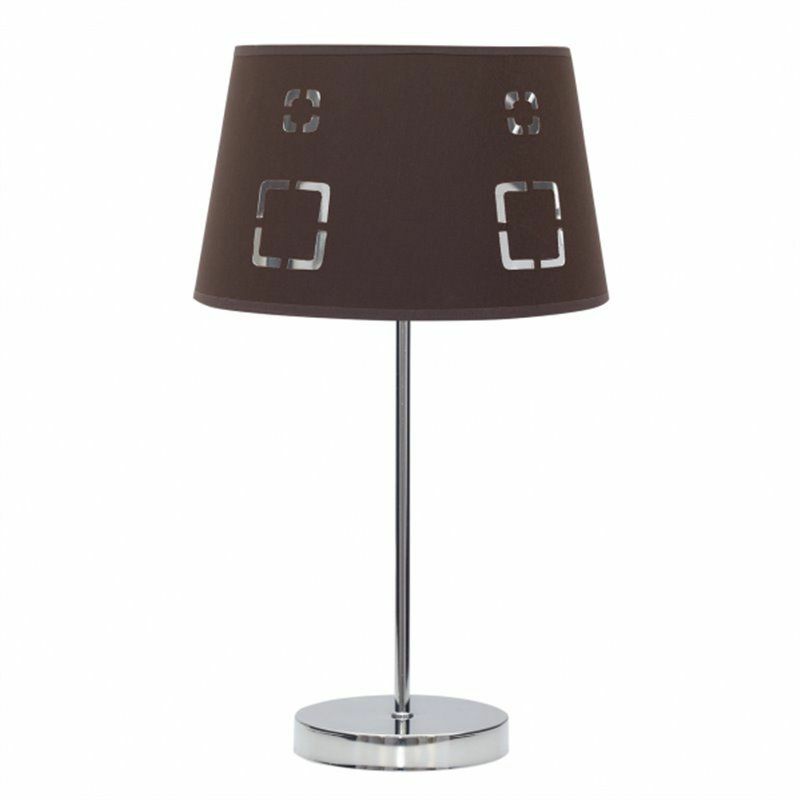 Desktop marrone della serie Celaya. Realizzato in metallo color cromo e materiale tessile. Il paralume è progettato con forme geometriche traforate che lasciano entrare la luce. Le sue dimensioni sono 43x25x25 cm. La lampada a sospensione e da terra sono disponibili in marrone e vari colori. Il portalampada è E14.