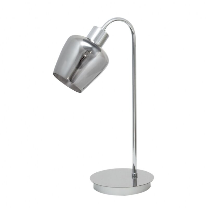 Tavolo serie Soline in colore cromo. Realizzato in metallo e vetro fumé. Dal design semplice ma molto moderno, misura 48X18X26 cm e il suo portalampada è E27. Può essere combinato con la sospensione a tre e cinque luci abbinata.