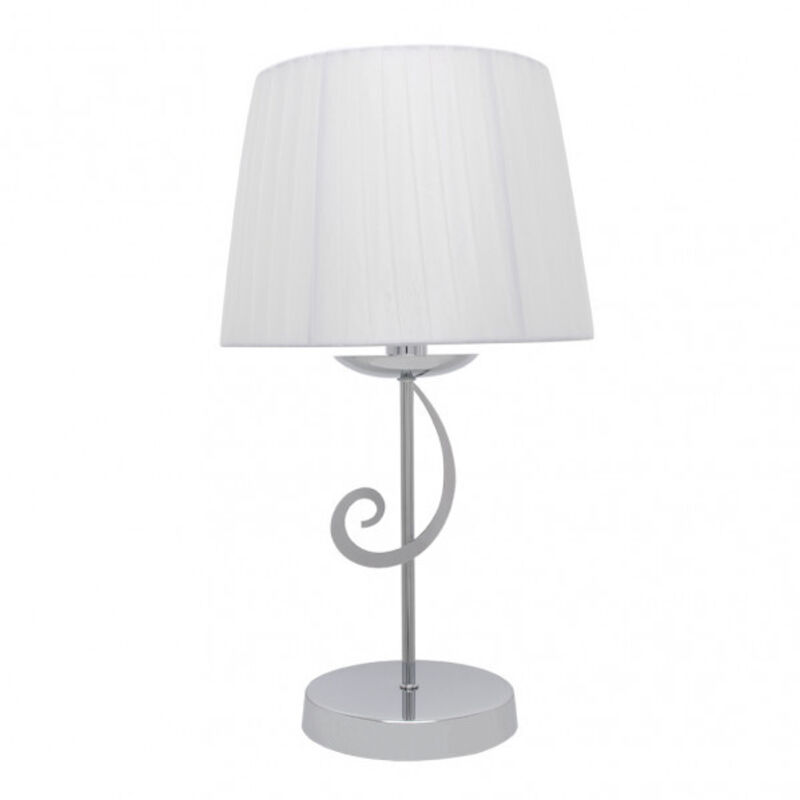 Desktop serie LUXOR in colore CROMO con schermo BIANCO. È fatto di metallo e materiale tessile. Ha una scocca dal design molto originale ed elegante, compatibile con i decori classici e anche con il nuovo stile Vintage. Ha un portalampada E14. Lampadina non inclusa. La sua dimensione è di 45x25x25 centimetri. La famiglia si completa con l'applique e le lampade a tre e cinque luci. Tutti disponibili anche in color cuoio con sfumatura beige.