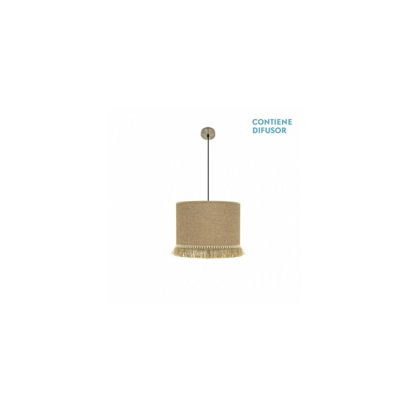 Pendente della serierie SIBBILA colore CUOIO/SABBIA, 60 centimetri di diametro. Dispone di tre portalampada E27, schermo con attacco M10. Lampadine non incluse. Con un paralume molto originale, realizzato in tessuto juta sacco e rifinito con una passamaneria con frange. Dallo stile moderno e dal design elegante, ideale per arredare e illuminare camere da letto, soggiorni e soggiorni, donando calore all'ambiente che illumina. Le sue dimensioni sono regolabili in altezza, 55