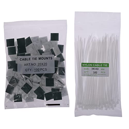 Faburo 100 pz Fascette Plastica per Cablaggio 150 mm x 2,5 mm Bianco + Supporto Autoadesivo per Fascette Stringicavo (20mm), Con Viti Autofilettanti, Cable Management, Ufficio, Garage e Officina