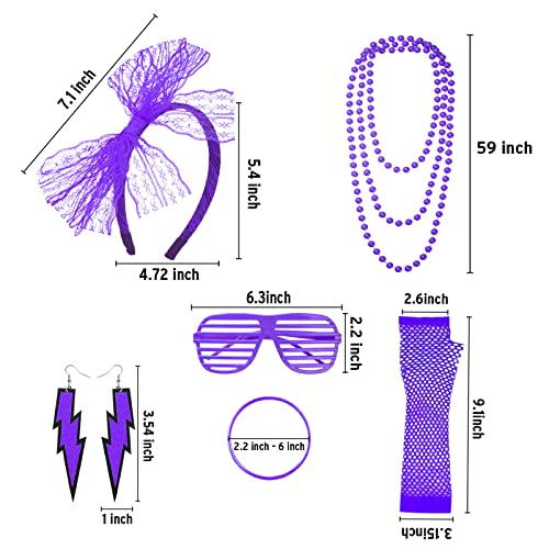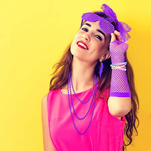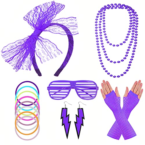 FACATH Collane in stile anni '80, con braccialetti e guanti a rete in pizzo, con fiocco, orecchini al neon, accessori per travestimenti, colore verde, per donne e ragazze (viola)