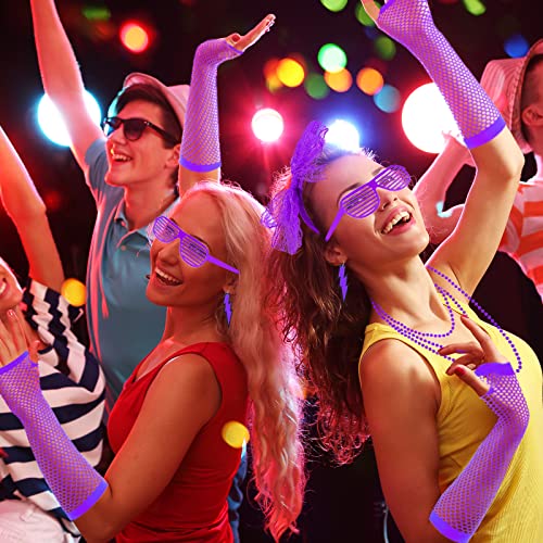 La confezione include: 1 paio di guanti a rete senza dita + 1 fascia in pizzo + 1 paio di occhiali da cosplay + 1 paio di orecchini retrò al neon + 10 braccialetti in silicone + 1 collana, soddisfano le esigenze per il set di accessori per costume anni '80 e il costume di Halloween.