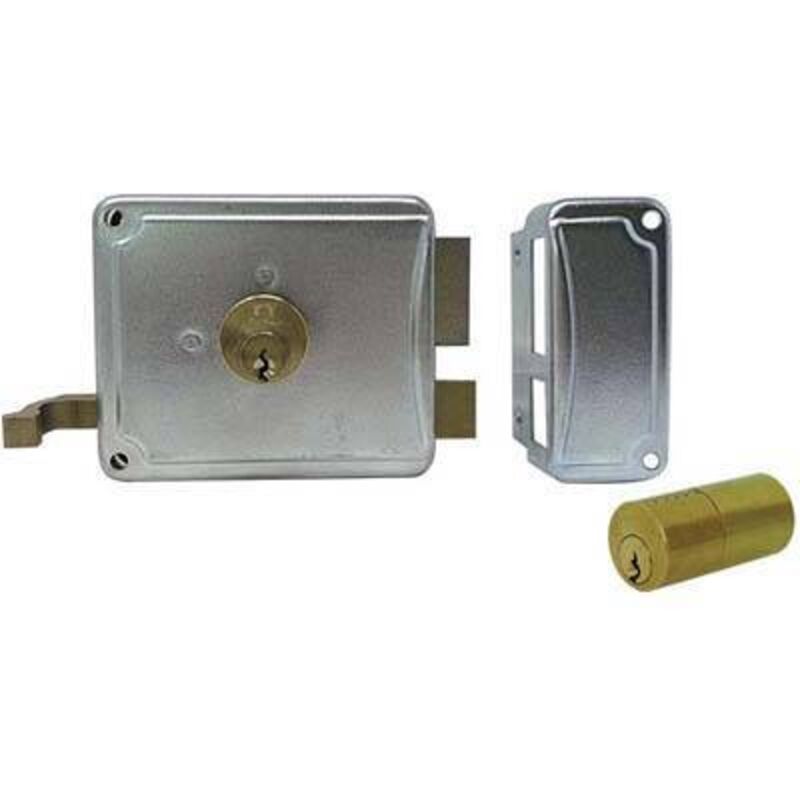 ZINCATA C.TONDO FISSO M2+SCR DX E.MM 50 Con doppio cilindro fisso interno ed esterno Mm. 50. Scrocco. Tirante. Chiusura con catenaccio a 2 mandate. Altezza scatola e bocchetta Mm. 85. In acciaio zincato. In dotazione: 3 chiavi piatte, 1 bocchetta e 1 borchia.