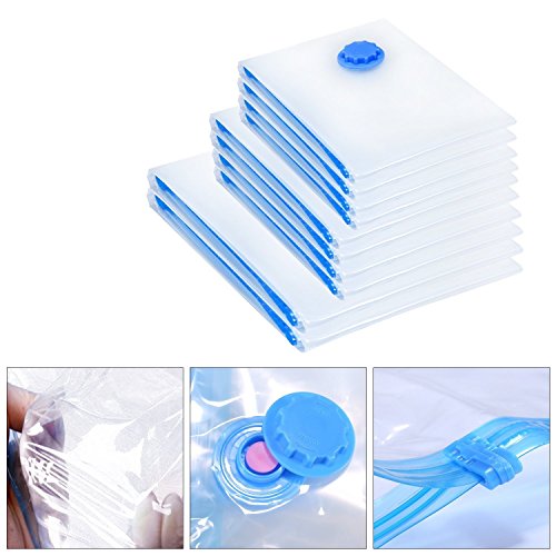 FINO A 75% DI SPAZIO IN PIÙ Le nostre borse sottovuoto consentono di risparmiare e triplicare lo spazio nei vostri armadi. È possibile utilizzarli anche in preparazione di un viaggio o per mantenere indumenti fuori stagione: ora avrete spazio a sufficienza in valigia e sugli scaffali. La chiusura di queste buste sottovuoto è garantita dalla doppia cerniera a valvola sigillata. L'aria viene aspirata dalla borsa e non può uscire!