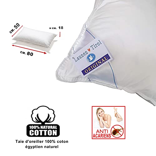 FacilCasa Guanciale in Vera Piuma d'oca, Cuscino Letto LAUNEN TIROL, 100% Piumette Bianche, Lavate, Sterilizzate, Federa Puro Cotone Egiziano, Qualità Marchio Daunex (cm 50X80 h 18) N 2 Rettangolari