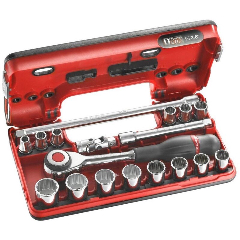 Descrizione Include: 1 x 3/8 cricchetto rapido con manico rotante - J.360. 14 x 3/8 12 punti metrici - J.8 - 9 - 10 - 11 - 12 - 13 - 14 - 15 - 17 - 18 - 21 - 22 mm. 1 x 3/8 cardano universale - J.240A. 2 x prolunghe di bloccaggio J.RC 3/8 - L 125 mm - L 250 mm Custodia vuota.