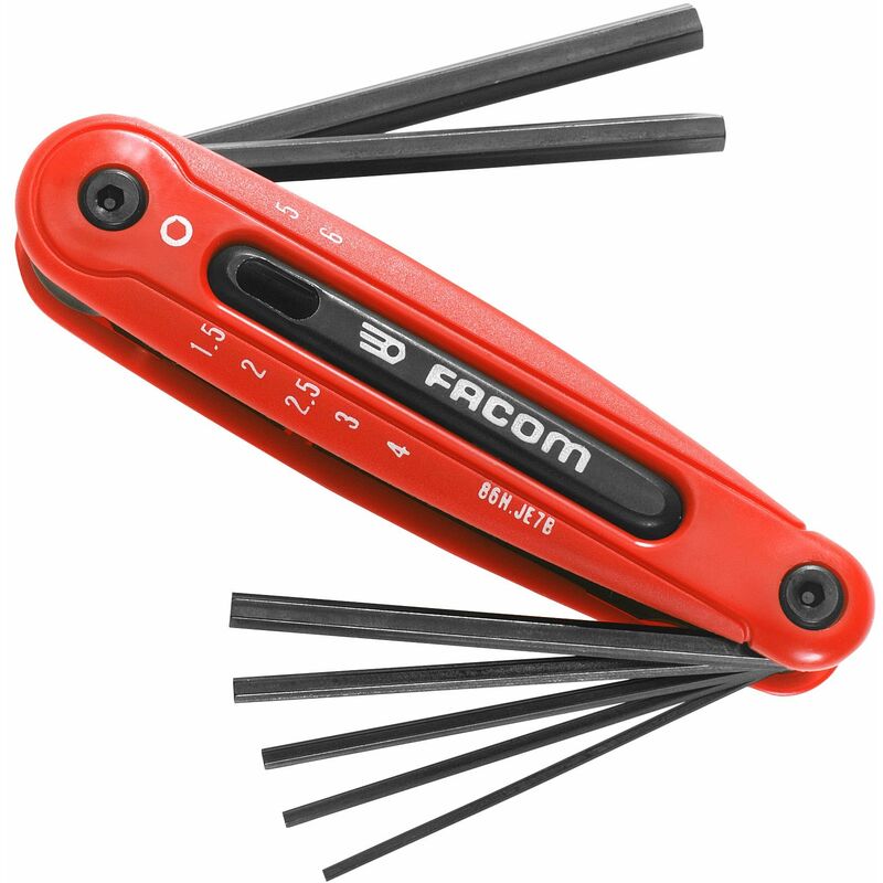 Descrizione Descrizione Il set di 7 chiavi maschio SC.86H.JE7A FACOM da 118 mm offre ai professionisti 7 dimensioni più comuni di chiavi maschio da 1,5 - 2 - 2,5 - 3 - 4 - 5 e 6 mm, per adattarsi a una moltitudine di applicazioni. Offre all'utente la possibilità di posizionare le lame a 90 ° per completare i morsetti che richiedono potenti coppie di serraggio e a 180 ° per godere di un approccio e di un rapido recupero. Dispone di superfici di presa solide e piacevoli per una maneggevolezza sicura, facile e confortevole, e un trasferimento di coppie significativo. Costruzione robusta realizzata con materiali di alta qualità con trattamento termico di precisione, lo strumento garantisce resistenza a prova e una migliore durata. Di lunghezza sufficiente e dimensioni compatte, le chiavi semplificano il serraggio in luoghi angusti e difficili da raggiungere. Una volta piegate le lame, il set di chiavi maschio è facile da riporre e trasportare. Avviso di sicurezza E FACOM