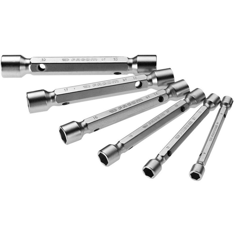 SET 6 CHIAVI TUBO DOPPIO mm: ( Chiave a barra doppia: l'apertura completa della chiave facilita il passaggio di aste filettate molto lunghe, il corpo esagonale forgiato consente un serraggio con una chiave, presentazione: cromata satinata).