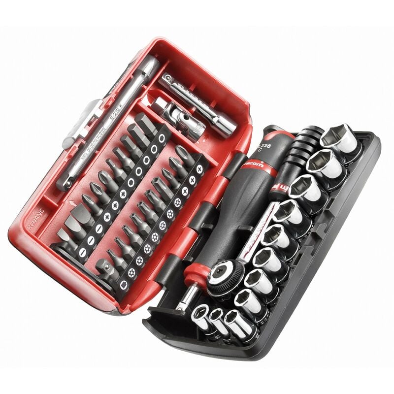 Set compatto di serraggio 1/4 + set di avvitamento 38 strumenti - 1 cricchetto Radio - 10 bussole esagonali (5,5 - 6 - 8 - 9 - 10 - 11 - 12 - 13 - 14 mm) - 2 prolunghe (55 e 100 mm) - 1 cardano articolato - 1 maniglia di serraggio - 1 portainserti - 22 inserti (3 slot, 5 maschi, 7 Torx, 3 phillips, 3 Pozidriv, 1 quadrato di allenamento) - Venduto Per Confezione