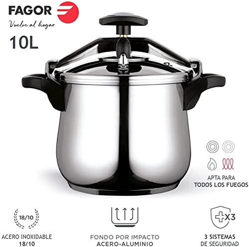 Fagor Classica pompa pentola a pressione 10 litri, induzione, Express, acciaio inossidabile 18/10, tutti i tipi di cucina, fondo termico, diffusore, 3 sistemi di sicurezza, include cucchiai Melier in