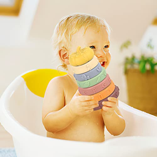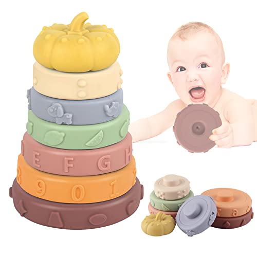 FainFun Giocattoli Impilabili con Anelli, 7 Pezzi Giochi Montessoriani, Forme Sensoriali, Squeeze Dentizione Giocattolo per Bambini, Cerchi Impilabili Bambini, Giocattolo Regalo per 6-12 Mesi