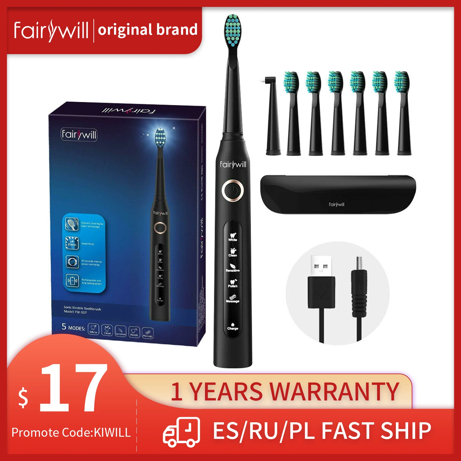 Fairywill FW507 Electric Toothbrush 5 Mode USB Charge Oral Clean Sonic Toothbrush Waterproof Replacement Heads Travel Case Adult