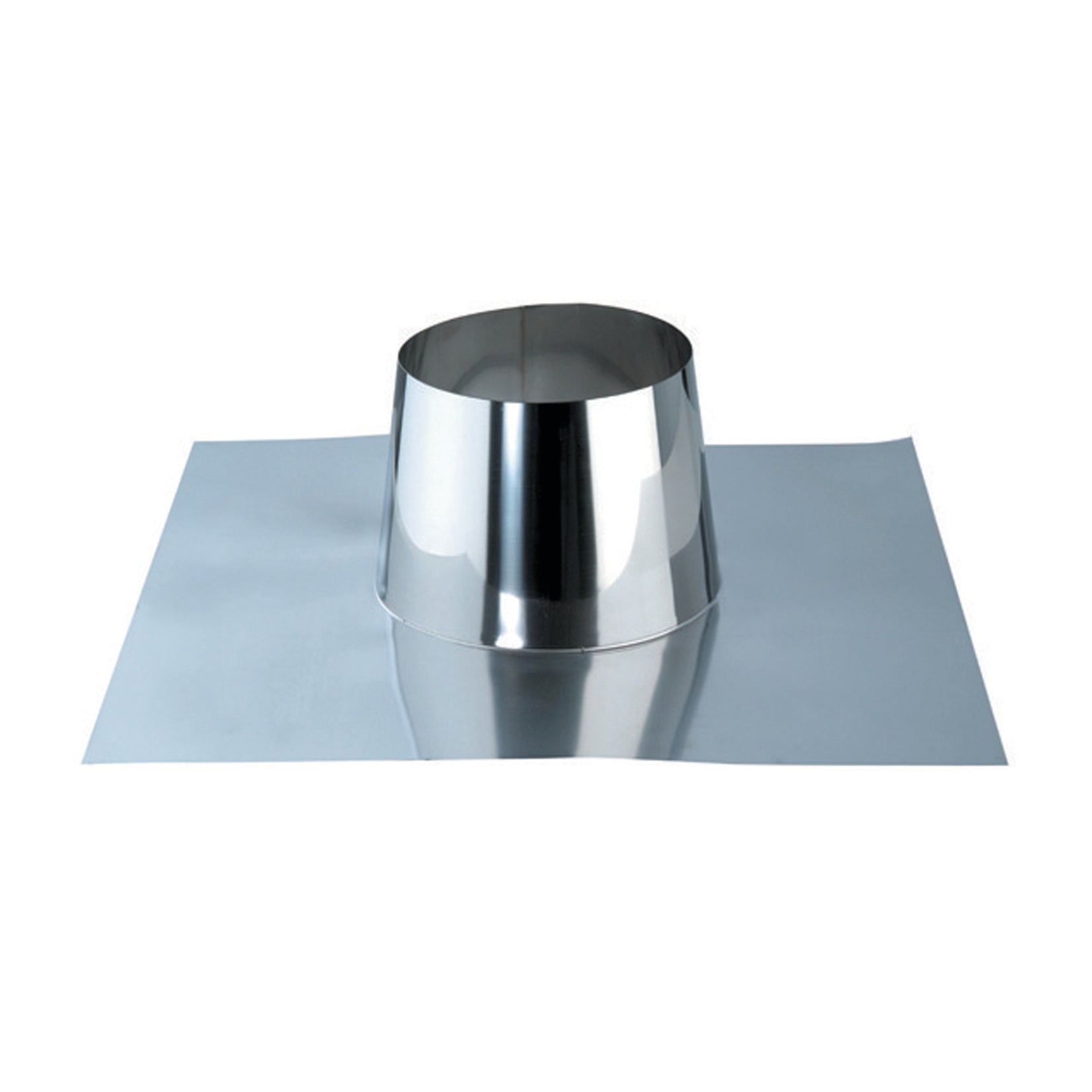 Faldale inox piano per mono parete Dn 120 mm. Utilizzato sulla falda del tetto piano sotto le tegole. da utilizzare con apposita fasetta anti-intemperie. Si adegua perfettamente all'andamento del tetto coprendo il foro, garantendo una superficie di appoggio per le tegole corretta.