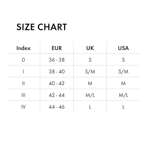taglie: S (DE 36-38), S-M (DE 38-40), M (DE 40-42), M-L (DE 42-44), L (DE 44-46)