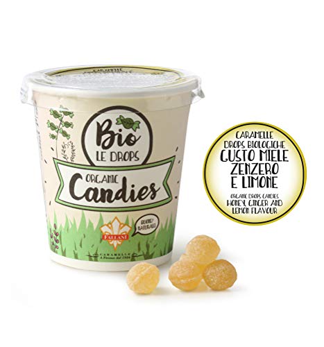 FALLANI CARAMELLE Organic Candies, Bio Le Drops, caramelle zuccherate, 12 bicchierini da 50g (2 per gusto) mirtillo, sambuco, miele zenzero e limone, eucalipto, miele, liquirizia, caramelle bio