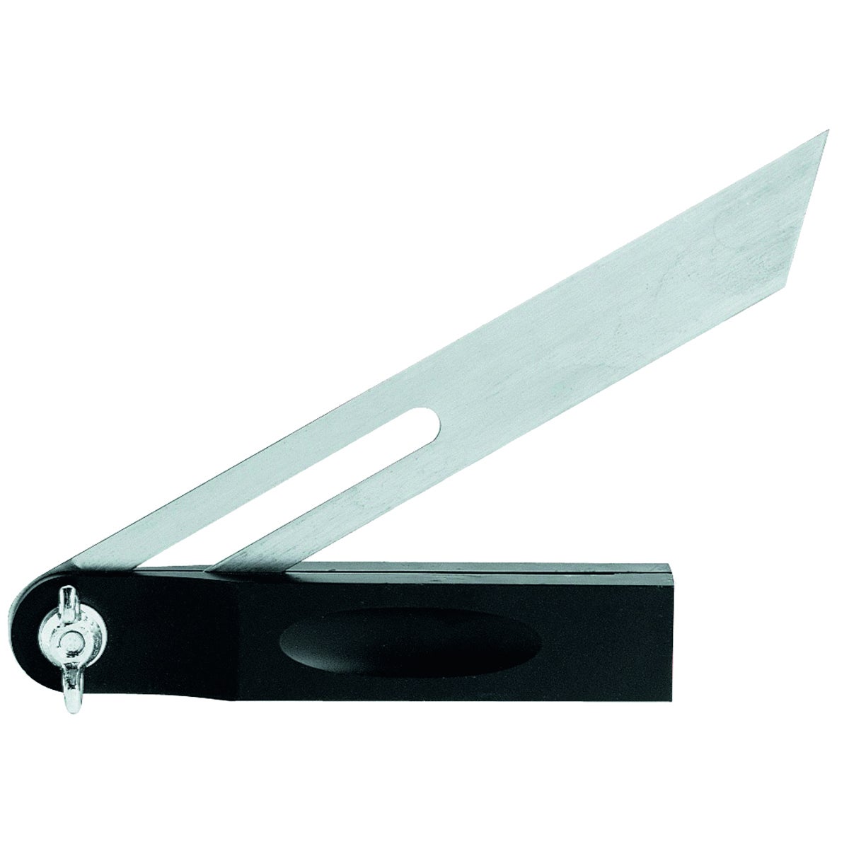 Falsa squadra regolabile, lunghezza 210 mm. Base in materiale sintetico con scanalatura per la presa. Sistema di bloccaggio della lama. Lama scorrevole in acciaio al carbonio