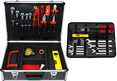Contenuto della confezione: 4 pinze, martello, cacciavite, livello 5, 10 chiavi combinate da 6 a 19 mm, 8 chiavi esagonali, tester di tensione da 230 V, 2 file, metro a nastro e molto altro ancora.