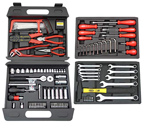 Include: 4 pinze, 10 chiavi combinati, chiavi a bussola, seghe universali, 8 cacciaviti, metro a nastro ed altro ancora.