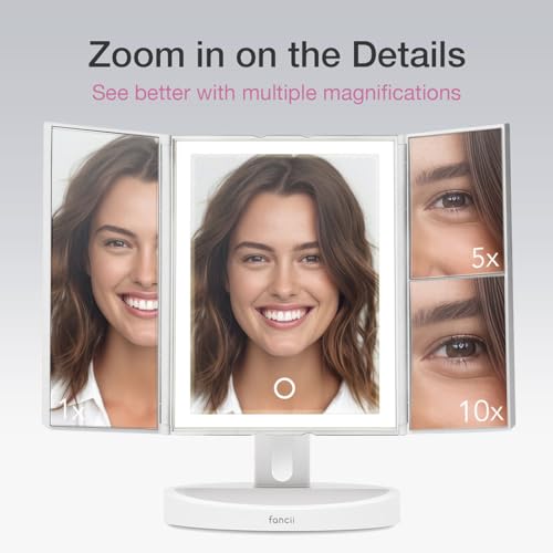 Fancii Specchio per il Trucco con Luci LED, 10x /5x/1x Ingranditore, Ricaricabile - 68 Dimmerabile Luci, Touch Screen, Specchio da Tavolo Regolabile, Supporto Cosmetico, Tria 2