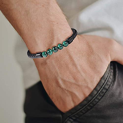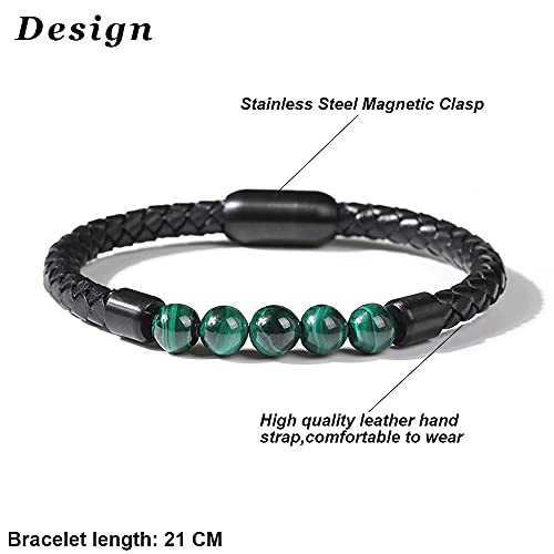 FANCIME Uomo Vera Pelle Bracciale Malachite Perline con Chiusura Magnetica Gioielli Regalo per Uomo Ragazzo - Lunghezza 21CM