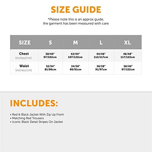 Il costume comprende giacca rossa con chiusura a zip con strisce nere e pantaloni rossi abbinati.