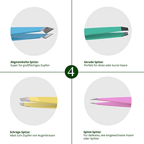 Fancy - Set di pinzette per rimuovere le sopracciglia e i capelli, con custodia (4 pezzi), in acciaio inox colorato, 4 diverse punte