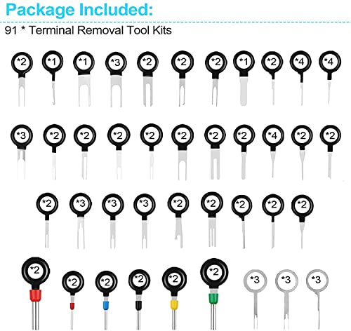 Ampia applicazione: il kit di strumenti per la rimozione dei pin elettrici include 91 strumenti di riparazione per l'estrazione dei terminali delle prese per auto di diversi tipi, può essere ampiamente utilizzato per la maggior parte della rimozione dei terminali dei connettori, dei terminali del cablaggio del selettore e della rimozione dei pin a crimpare dei connettori come automobili, cablaggi ed elettrodomestici.