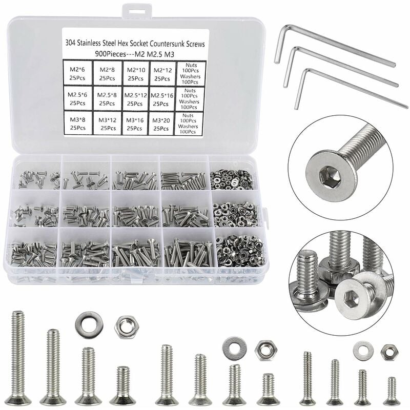 FandWay 900 viti a testa piatta M2 M2.5 M3 con testa piatta in acciaio inossidabile 304 viti esagonali svasate e dadi kit assortimento con 4 chiavi esagonali 【Caratteristiche】 - Questo kit M2 M2.5 M3 può essere ampiamente utilizzato in tutti i tipi di macchinari di precisione, strumenti classificati, strumenti, prodotti elettronici, elettrodomestici, prodotti di comunicazione, serrature, lampade, luci, giocattoli, ecc. - Il kit di viti è realizzato in acciaio inossidabile 304, ad alta resistenza, antiruggine e resistente alla corrosione. - Questo kit di assortimento di viti viene fornito in una scatola separata per cinture. Facile da riporre e ottenere queste viti. 【Specifiche】 - Nome del prodotto: Vite a testa piatta/Viti a testa svasata esagonale. - Colore: argento. - Materiale: acciaio inossidabile 304 - Confezione: scatola di plastica resistente. Contenuto della confezione: M2 x 6 -25 pezzi M2 * 8-25 pezzi M2 x 10 -25 pezzi M2*