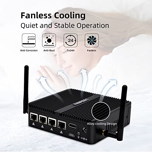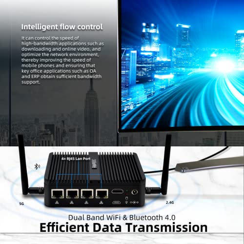 [MINI PC 4 ETHERNET WIFI 5 BT 4.0] 4 porte LAN RJ45 fanno sì che questo mini pc firewall acceda a diverse extranet contemporaneamente e lo renda un potente router. Il mini pc Dual-Band WiFi 5 migliora anche significativamente le prestazioni della rete wireless e mantiene una velocità stabile e affidabile per scaricare o caricare file o video. BT 4.0, più risparmio energetico, basso costo, bassa latenza e ha una distanza di connessione effettiva ultra lunga.