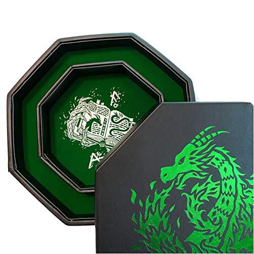 Fantasydice Green Fire Dragon - Vassoio per dadi - Ottagono 20 cm con coperchio e area di scena dei dadi - contiene 5 set di dadi (7 / standard) per tutti i RPG da tavolo come D & D, Call of Cthulhu