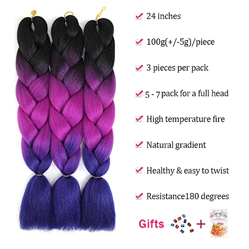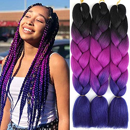 FanYu 3 confezioni di capelli sintetici intrecciati da donna, per trecce all'uncinetto (nero-viola-blu)