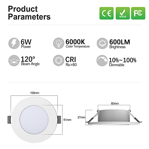Faretti LED da Incasso per Cartongesso Dimmerabile, 6W 600LM Luci da Soffitto Interno, Ultrasottili 25mm, Diametro Foro Ø65 - Ø95mm, Senza Dimmer, 230V, Bianca Fredda 6000K, 6 Pezzi