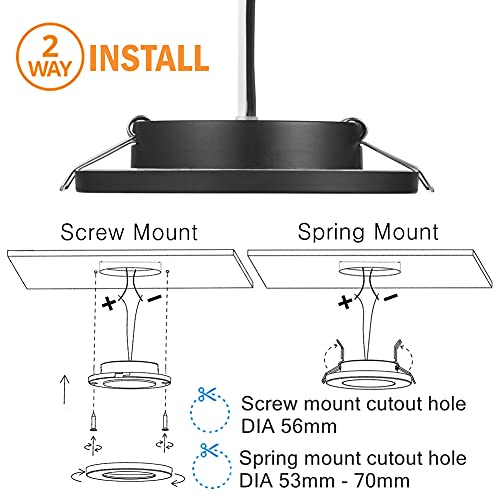 Basso profilo & Monte incassato - Montaggio a incasso con clip a molla o montaggio con viti, lampada a filo con il soffitto o la superficie dell'armadio, aspetto molto pulito. Spessore solo 18 mm design sottile, leggero e compatto si adatta a luoghi stretti. Come cucina, armadio, salone furgone, doccia e soffitto della barca camper, ecc.