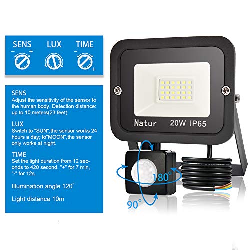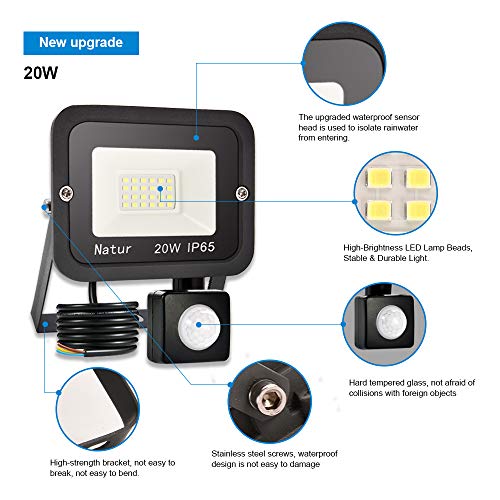 6 faretti LED da 20W con sensore di movimento, 6000 K, super luminosi, per esterni, IP65, per giardino, garage, campi sportivi