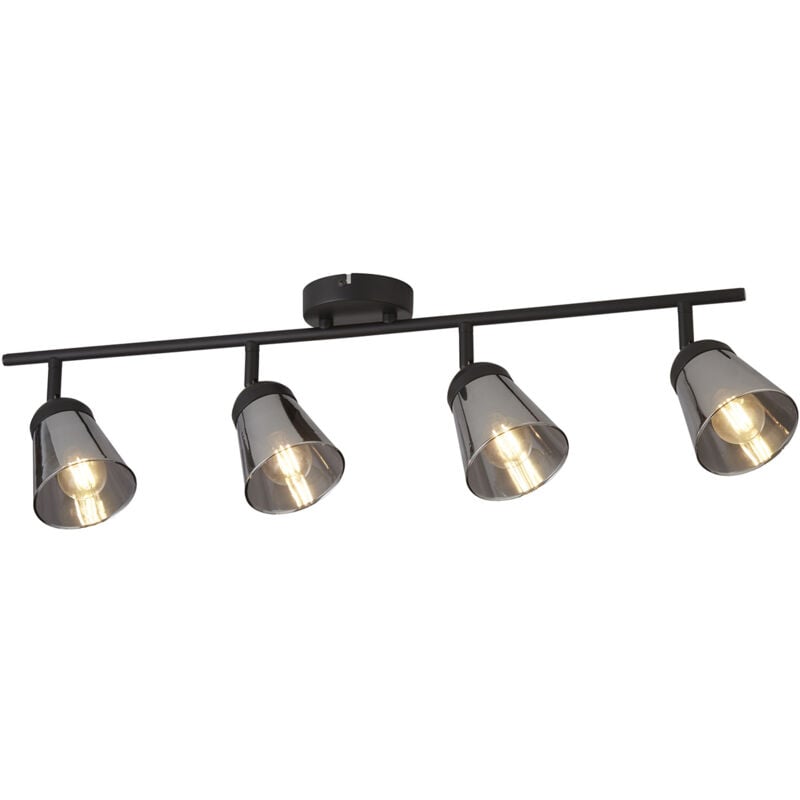 Collezione Mega MODERNA E FUNZIONALE Il faretto da bar Mega 4Lt è un'aggiunta elegante e funzionale che aggiunge un tocco di modernità a qualsiasi spazio. Realizzato in resistente metallo nero e vetro fumé, presenta un design elegante e contemporaneo che si abbina a un'ampia gamma di stili di interior design. Con i suoi paralumi in vetro fumé, la natura colorata e semitrasparente del vetro crea un'estetica sofisticata e moderna, rendendolo la scelta ideale per spazi contemporanei, industriali o anche di ispirazione vintage. I 4 paralumi in vetro fumé sono completamente regolabili per dirigere la luce dove necessaria, rendendola una luce ideale per una zona giorno o anche per una cucina.