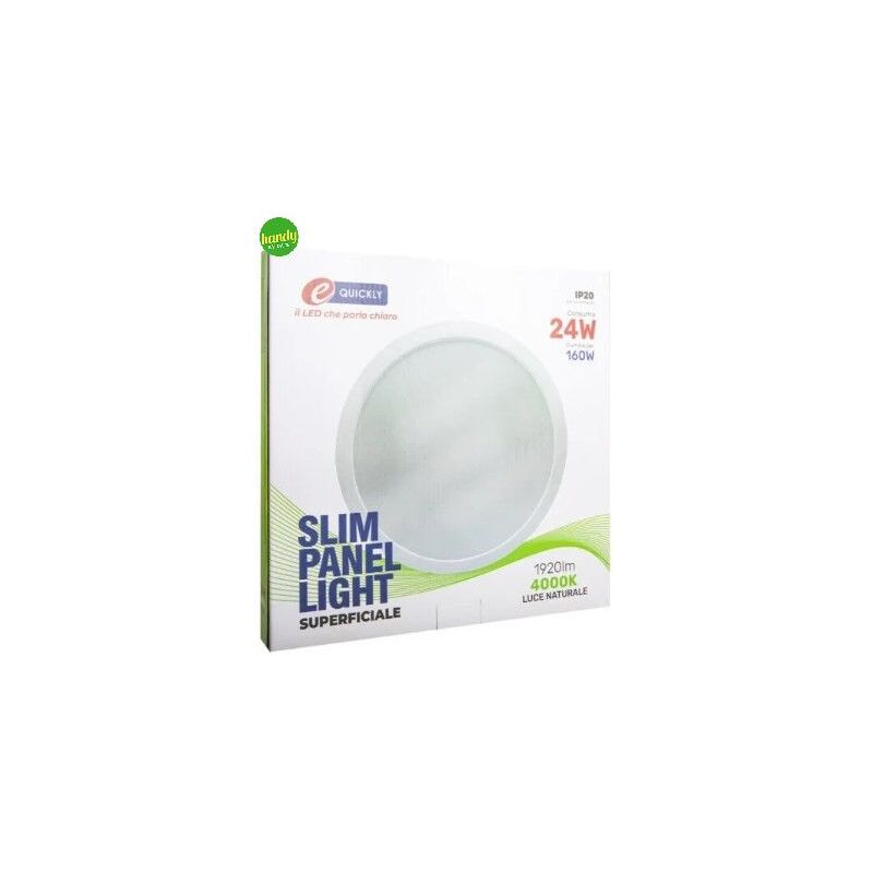 Faretto Led prodotto dal brand E-Quickly. Faretto da incasso rotondo con potenza di 24W può generare 1920 lumen, luce bianca naturale perfetta 4000K,l'efficienza della luce è uniforme e omogenea. Angolo di fascio luminoso di 120°. Il faretto corrisponde ad una lampadina a incandescenza convenzionale da 160 W. Grado di protezione IP20, ciò significa che è protetto contro l'ingresso di oggetti solidi più grandi di 12 mm Ø ma non è protetto dall'acqua.