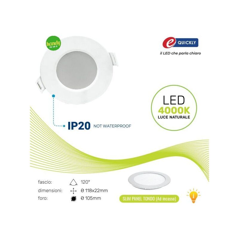 Faretto Led prodotto dal brand E-Quickly. Faretto da incasso rotondo con potenza di 6W può generare 480 lumen, luce bianca naturale perfetta 4000K, l'efficienza della luce è uniforme e omogenea. Angolo di fascio luminoso di120°. Il faretto corrisponde ad una lampadina a incandescenza convenzionale da 40 W. Grado di protezione IP20, ciò significa che è protetto contro l'ingresso di oggetti solidi più grandi di 12 mm Ø ma non è protetto dall'acqua.