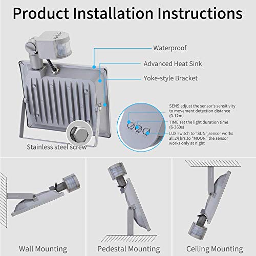 Facile da impostare: il proiettore a LED con sensore ha tre pulsanti. È possibile impostare facilmente la distanza di rilevamento, il tempo di rilevamento e il tempo di illuminazione. SENS: regola la sensibilità del sensore alla distanza di rilevamento del movimento (0-12 M). TIME: imposta la durata della luce tempo (6-360s) .LUX: passa a "SUN", il sensore funziona tutte le 24 ore. passa a "MOON", il sensore funziona solo di notte.