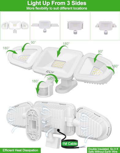 【Super luminoso e Design 3 teste】Il faretto led da esterno con sensore di movimento 42W è progettato con 3 teste regolabili e l'angolo del fascio raggiunge 270° in 3 direzioni diverse. Questo faretto per esterni può produrre 3600LM di luce bianca fredda, risparmiando oltre il 90% di energia, più pratico delle luci per esterni a testa singola e doppia, ideale per gli angoli.